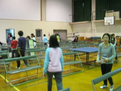 まず,マットやいすを並べて座席を整えました。次に,それぞれの係に分かれ,当日の動きを考えながら最終打ち合わせをしました。