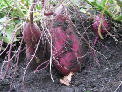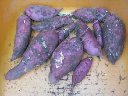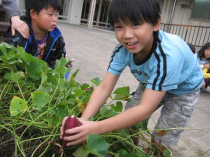 学校園の花壇に植えていたさつまいもを収穫しました。そおっと手で掘り進め,さつまいもの頭が見えてくると歓声があがりました。さつまいもは大きいものから小さいものまで,形もいろいろですがおいしそうな色をしています。まるまるふとったおいもさんをみて,「はやく食べたいなあ。」と楽しみな様子です。しばらくしたら,2年生でおいしくいただこうと思っています。