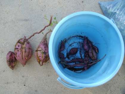 夏から育ててきたさつまいもの収穫をしました。思ったほど数はとれませんでしたが,大きいものもありました。「大きなかぶ」のお話のように「うんとこしょ,どっこいしょ」とかけ声をかけながら抜いていました。