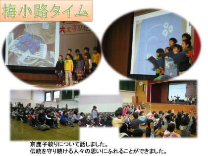 自分の思いや考えを分かりやすく伝えるための取組「梅小路タイム」がありました。今日は3年生が,先日体験した「京鹿の子絞り」について話しました。話した後,クイズをしたり感想を話したりして,双方向の会になりました。