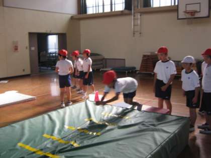 体育の学習でマット運動を取組んでいます。前転の技や後転の技,側転の技の全部で8種類の技に挑戦しています。ねらい1・ねらい2と一人一人が自分のめあてをもって練習に励んでいます。とび前転やロンダートなど力強い技にも挑戦しています。新しい技にどこまで挑戦できるかみんな頑張っています。