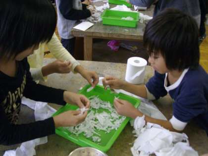 トイレットペーパーを細かくちぎったところに,水と洗濯のりを入れて作った紙ねんどです。班ごとにトイレットペーパーを細かくちぎって,水と洗濯のりを入れて手で混ぜていきました。