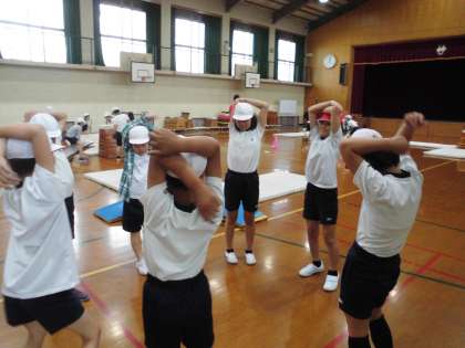 体育の学習で「とび箱」を行っています。初めに場つくりから始まり,ストレッチを行い場も身体も安全を確かめます。