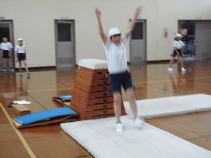 その後は,開脚とび・かかえ込み跳び・仰向け跳び・台上前転など高さや距離に挑戦しています。
