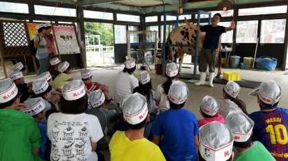 記念写真を撮って、乳しぼり体験です。