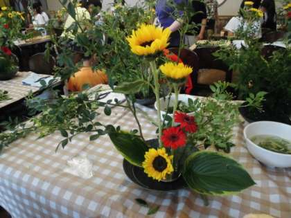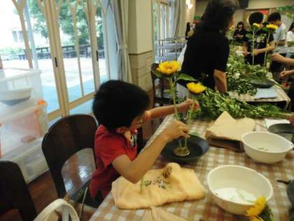 大人が考えるよりも子供たちは自由に大胆に花を切り,生けていきました。みんな同じ種類の花でしたが,それぞれ個性あふれる作品に仕上がりました。