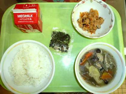 「防災とボランティアの日」の献立です。すいとんは昔食べ物が不足していた時代にご飯の代わりに食べられていました。給食では,当時のことも考えていろいろな食べ物が食べられることに感謝しながら,鶏肉・しめじ・ごぼう・にんじんを入れて具だくさんのすいとんにしました。小麦粉・かたくり粉をよく練って作ったおだんごは子どもたちに大人気でした。ツナとにんじん・しいたけ・たまねぎを使ったそぼろどんぶりも「おいしい」「もっとおかわりしたい」と大喜びで食べていました。