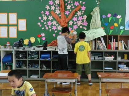 先日の道徳の学習で,学校の中の「ヘンだな〜。おかしいな〜。」というものを探しました。トイレのスリッパがグチャグチャ…ヘンだな〜…と思ったら,揃えてあげようね。ゴミが落ちている…ヘンだな〜…と思ったら,拾ってゴミ箱へ。本がグチャグチャ…ヘンだな〜…と思ったら,きれいに並べてあげよう。そんな学習をしたら,本棚の本をきれいに並べている姿を発見!自ら気づいて行動…すばらしいです!