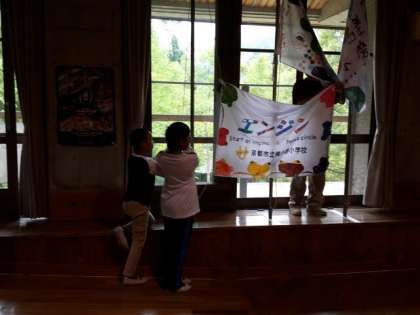 校歌を歌って、旗をあげます。