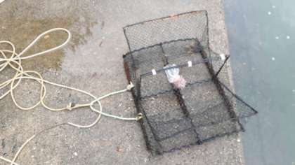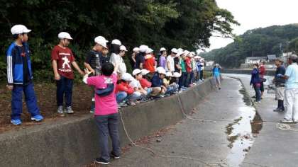 野外炊事の前に,明日のプログラムのかご漁のしかけをします。