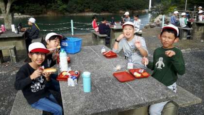 今日はお天気なので、深谷水道を見ながら、お外で食事です。