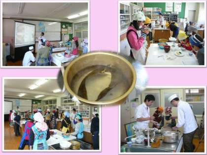 だしをとる昆布や鰹節について教えていただいたり,プロが取っただしを味わった後,3人の先生に教えていただきながら,子どもたちも自分達でだしをとってお吸い物にして味わいました。