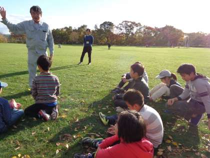 自然観察クラブは先月の活動で冬芝の種をまかせてもらいました。そこから伸びた芝を刈るために15日(木)に梅小路公園へ行きました。