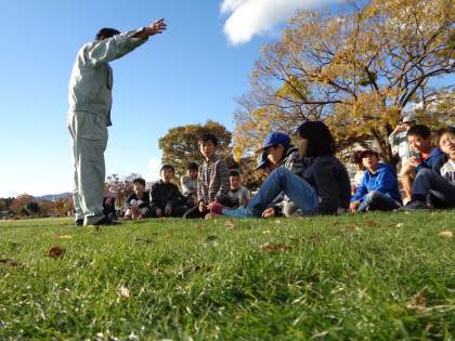 みんなで順番に芝刈り機を使って刈っていきました。(梅小路公園の芝生を刈る時は機械を使って刈り,また別の機械を使って草を集めるそうです。)普段はできない経験ができて子どもたちは嬉しそうでした。