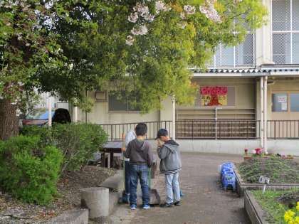 朝休み。運動場で元気に遊んでいる友だちがいる中で,ほうきではき掃除をしてくれている5年生の姿がありました。事情を聴いてみると「桜の花びらがたくさん落ちているのではいています。」とのこと。