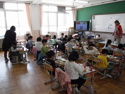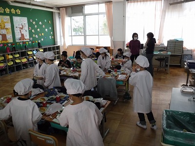 今日から給食がスタートしました。1年生にとっては初めて小学校で食べる給食です。みんなで協力をしてしっかりと準備ができました。今日の献立は,ミートスパゲティ,ホウレン草のソテイ,小型コッペパン,りんごゼリーと牛乳です。「いただきまーす。」と元気よく挨拶をして,おいしく頂きました。
