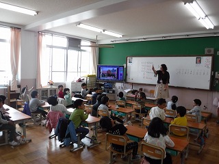 パワーアップタイムで1年生の教室に,ヴェロニカ先生がきてくれました。英語でクイズ方式で楽しみながら自己紹介をしてくれました。