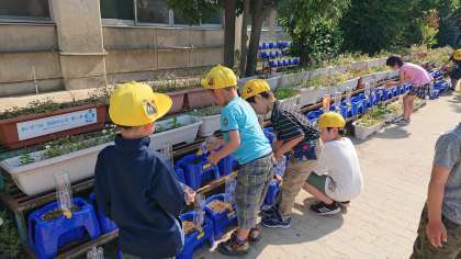 1年生は,先週の金曜日に種をまいたアサガオにお水をあげています。