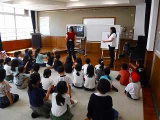 本日第1回目のEnjoy Englishを行いました。ALTのアプト・ヴェロニカ先生が来ていただく日の休み時間に,英語を使って楽しくゲームをしたり,歌ったりしながら英語に親しんでいくことを目標にしています。今日は,英語でじゃんけんと歌に合わせて体を動かすことをしました。子どもたちはとても楽しんで活動をしていました。次を楽しみにしている様子でした。