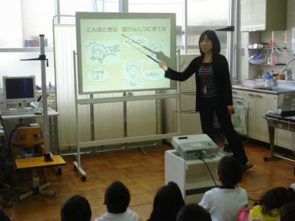 養護教諭の早田先生から,絵を見ながら身体計測のこと,どんな時に保健室に来たらよいのかなどを学びました。その後,身長,座高,体重をはかってもらいました。みんな静かにしっかりと話を聞いていました。