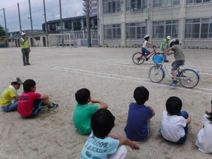 6月11日の3時間目4時間目に自転車教室がありました。地域の方警察官の方に来て頂いて,交通ルールや自転車の乗り方を教えていただきました。