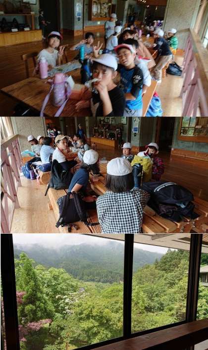 お弁当タイムでは,はじめ外でお弁当を食べていましたが,雨が降ってきたので,中に入って食べました。食べ終わったら。てるてる坊主のおかげで,またよい天気になりました。「山の天気は変わりやすいなぁ!」みんな実感しました。