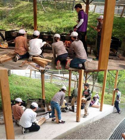 火の係,おかず係,ごはん係,それぞれの役割でコツコツと作業を進めていきます。