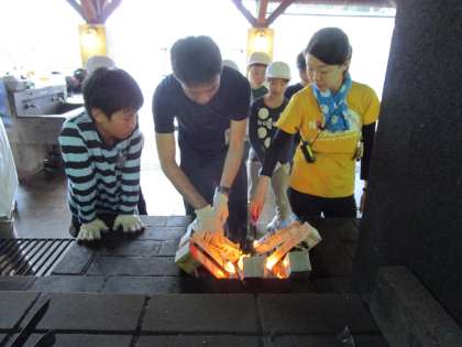 ホイルに包んだパンを牛乳パックに入れて、火をつけて焼きます。