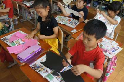 紙をびりびり破いて生まれた形を絵にしています。何に見えるかな?思いもよらない形が生まれたり,友だちからいいアイデアをもらったりして,楽しく作っています。