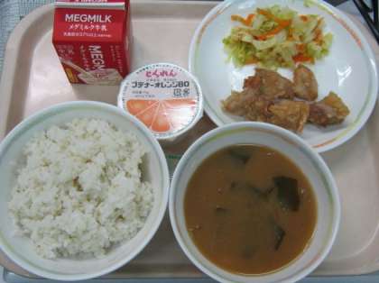 みそ汁は,じゃがいも・たまねぎ・わかめを入れました。温かく,こちらも子どもたちは喜んでおかわりして食べていました。