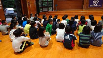 朝のつどいは、雨のため、プレイホールで行います。