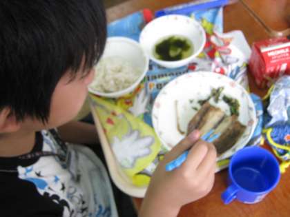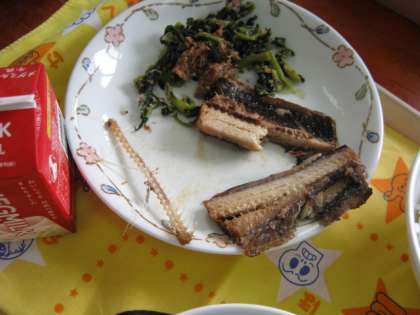 この日は給食に「さんまのかわりに」が出ました。魚を上手に半分にわって大きな骨を取り、上手に食べていました。お魚が好きな子も多かったです。