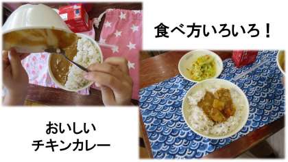 カレーの食べ方もいろいろ、ごはんを端に寄せてルーと半々にしたり,ドーナツ状にごはんを寄せて真ん中にルーを入れたり…みんなそれぞれおいしく食べていました。