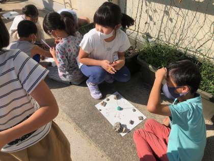 理科の学習で,かげと太陽の関係について調べています。今日はお天気がよかったので,一日を通して,かげが動いていくようすを観察することができました。