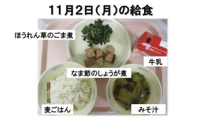 麦ごはん・牛乳・なま節のしょうが煮・ほうれん草のごま煮・みそ汁です。