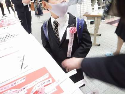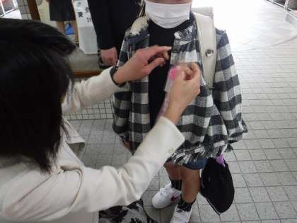 入学式の日。1年生は,かわいい手作りのコサージュをつけました。