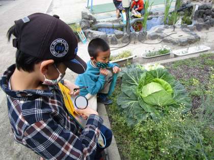 「虫眼鏡で見ると,大きく見えるね。」「キャベツに幼虫がいるよ。」など,発見したことを友達と伝え合っていました。