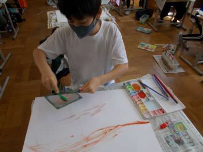 ドリッピングやにじみ,スパッタリング等,様々な技法を取り入れて絵を完成させました。