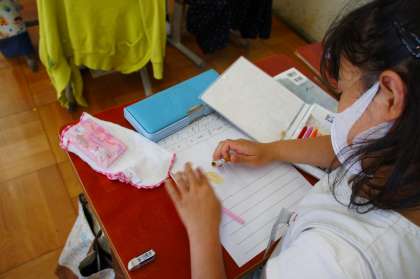 生活科の学習では,いろいろな野菜を育てる予定です。今回は「ダイズ」と「オクラ」の種を観察しました。