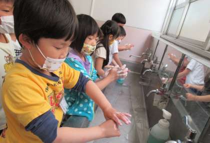 正しい手の洗い方を学んでから,再度手洗いに挑戦しました。