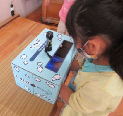 1年生では,洗い残しのない手洗いをするために,自分の普段の手洗いの仕方を見直しました。特殊な光を当てると白く光るクリームを手に塗って手洗いをし,光を当ててしっかり洗えていないところを目で見て確認しました。