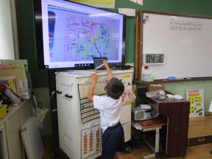 今日は,1組は八坂神社のあたりの様子を,2組は岡崎のあたりの様子について,地図や写真を見て調べました。
