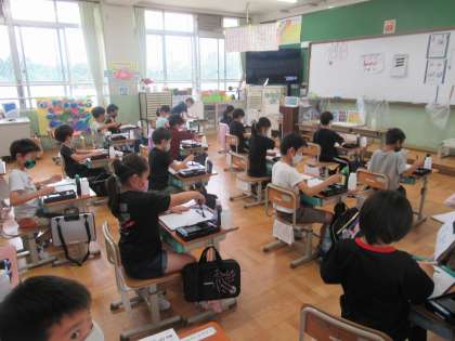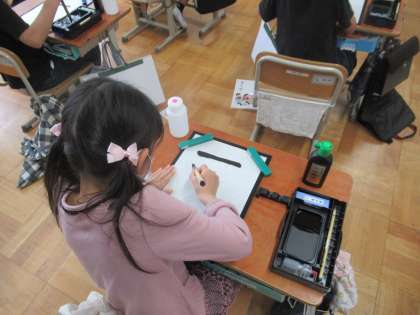 用具の扱い方を知り,いろいろな線を書きました。「えんぴつよりやわらかいね」「いろいろな太さで書けるね」など,筆との出会いに感動していました。後片付けも丁寧にできました。用具を大切に扱っていきたいですね。