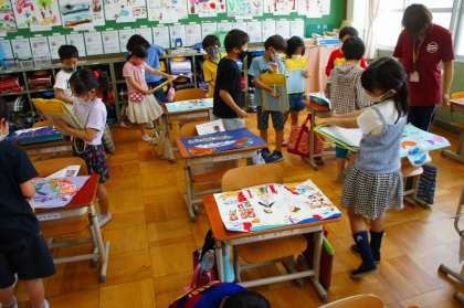学年合同で,先日完成させた「ふしぎな たまご」の鑑賞会を行いました。