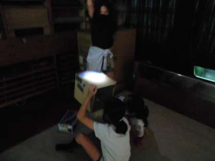 段ボールに開けた穴をのぞいて,見える光の差し具合から,自分だけの世界を作ろうという学習です。