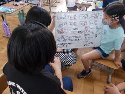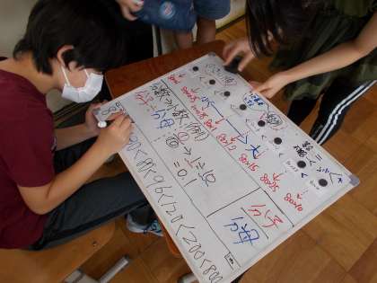 かける数と積の大きさの関係を考えました。グループごとに意見をまとめクラスワークをしました。1を基準に考えたグループ・小数,整数,分数の視点で考えたグループ・かけ算の式を積の大きい順に考えたグループなど様々な考えが出て,学習を深めることができました。