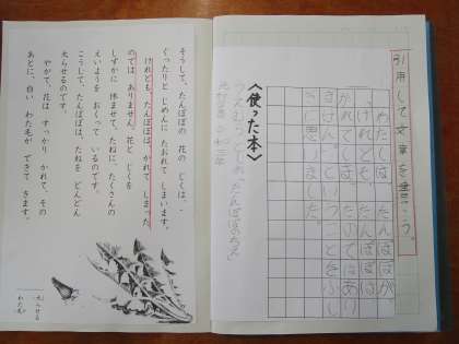 今日は,2年生で学習した「たんぽぽのちえ」で,不思議に思ったことを引用して文章に書きました。