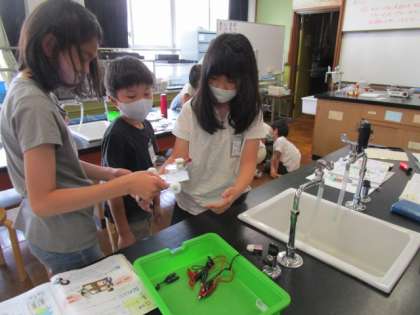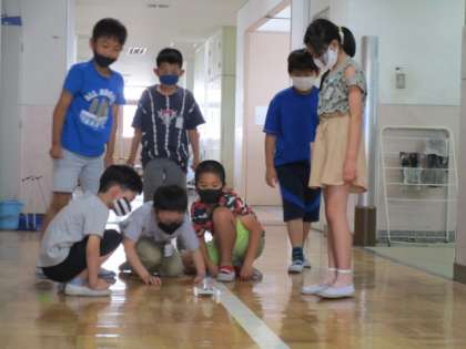 「速く回らないけれど,音は一番大きいよ。」や「速く回すには,つなぎ方を変えたらいいのかな。」など活動に楽しそうに取り組む姿がありました。