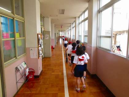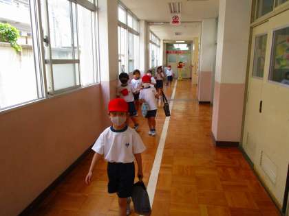 体育の学習の後,右側を歩いて教室に戻る2年生の子どもたち。教務の先生が見つけて,写真を撮ってくださいました。とても立派な姿です!
