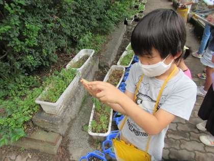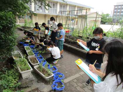 学年の畑と自分の植木鉢で育てている植物の観察をしました。葉の数が増えていたり,背丈が伸びていたりして,成長を感じることができました。